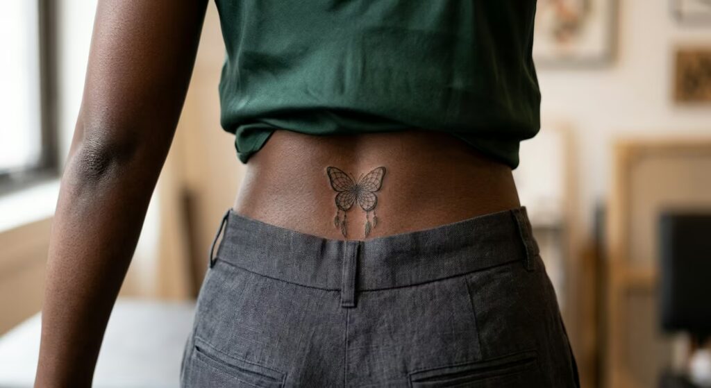The conceptual play here is smart — the butterfly as container for the dreamcatcher, both symbols associated with transformation and protection, merged into a single image that reads cleanly from a distance and rewards close examination. Nested naturally above the sacrum, it’s elegantly hidden and revealed at once, depending on what you’re wearing.